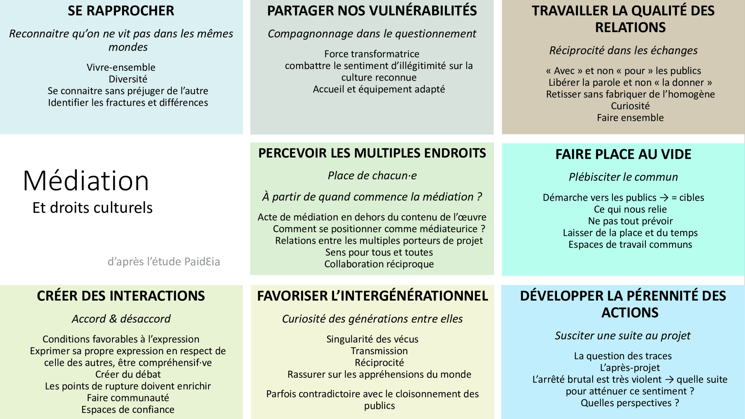 La médiation s’articule autour de deux enjeux qui s’articulent autour de ces 8 droits : la démocratisation et la démocratie culturelle.