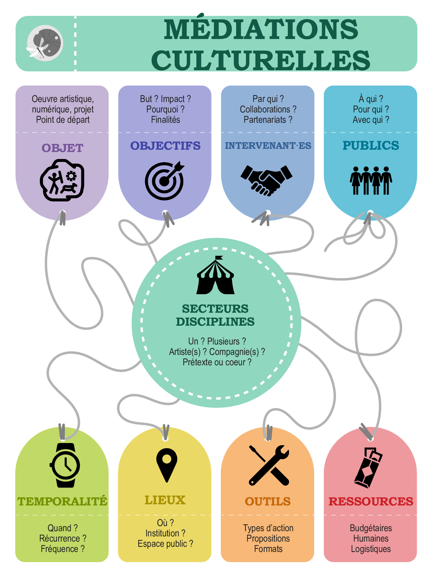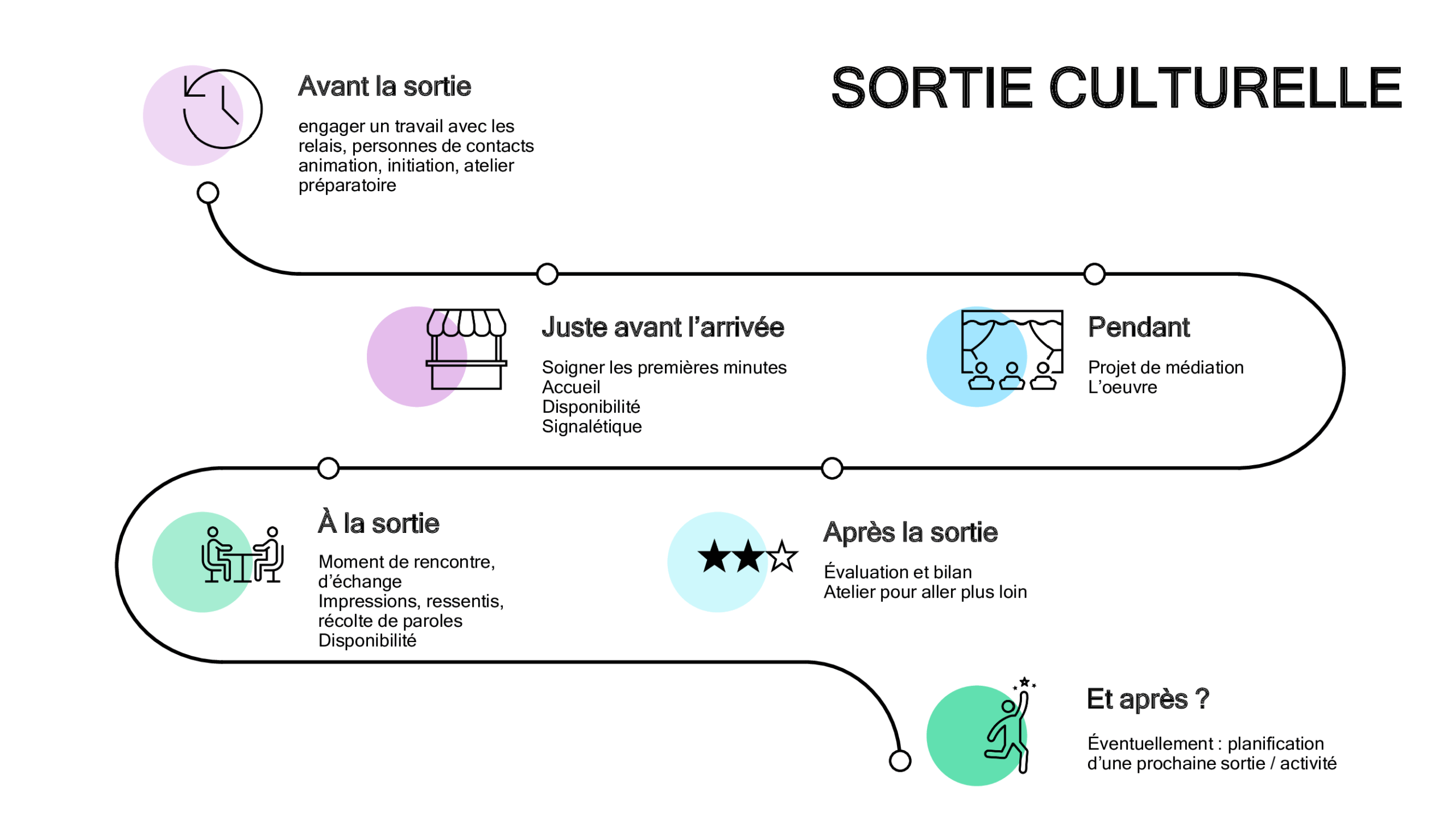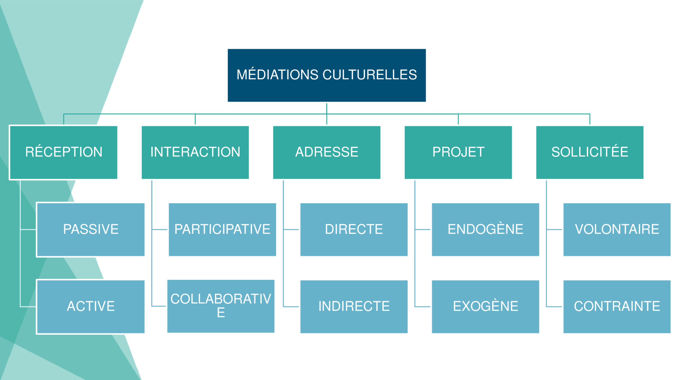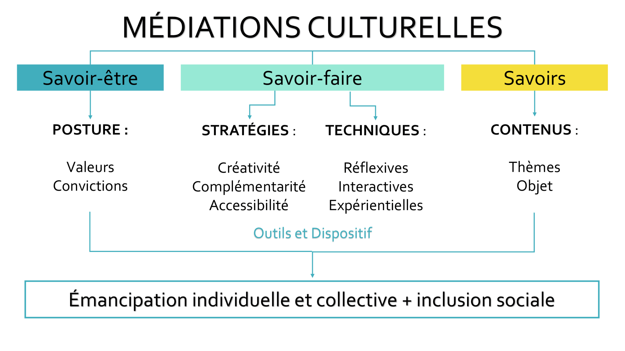La notion de médiation culturelle s’affirme comme un processus d’appropriation du sens, à travers un rapport personnalisé et vivant entre les références culturelles et les individus. Ultimement, elle vise à faire de chaque personne, visiteurice ou spectateurice, un·e véritable acteurice culturel·le.